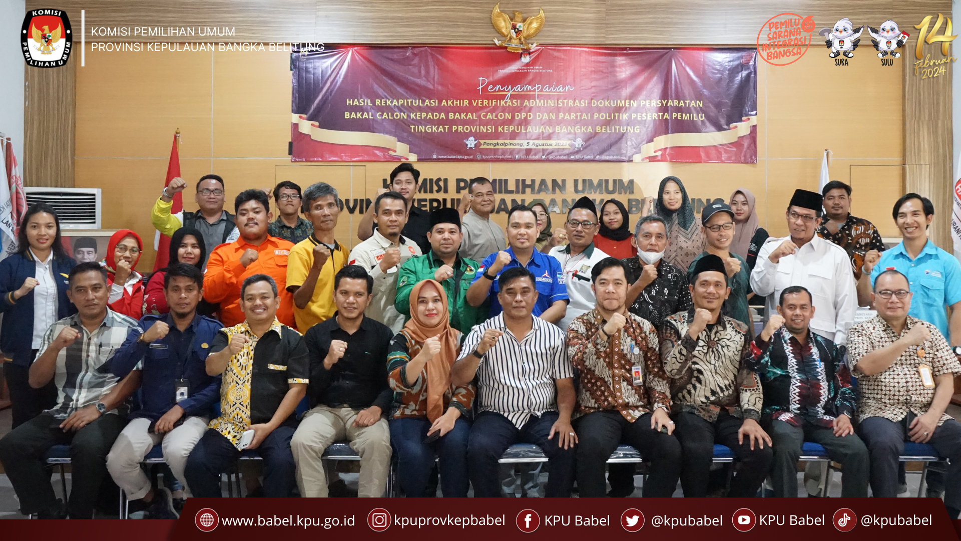 #SeperadikPemilih Komisi Pemilihan Umum (KPU) Provinsi Kepulauan Bangka Belitung melaksanakan Penyampaian Hasil Rekapitulasi Akhir Verifikasi Administrasi Dokumen Persyaratan Bakal Calon Kepada Bakal Calon DPD dan Partai Politik Peserta Pemilu Tingkat Provinsi Kepulauan Bangka Belitung. Pada kegiatan ini, KPU Babel mengundang Bakal Calon/LO DPD dan Partai Politik serta Bawaslu Babel untuk menyampaikan beberapa hal terkait tahapan pencalonan sekaligus menyerahkan BA Hasil Akhir Verifikasi Administrasi Dokumen Persyaratan Bakal Calon.