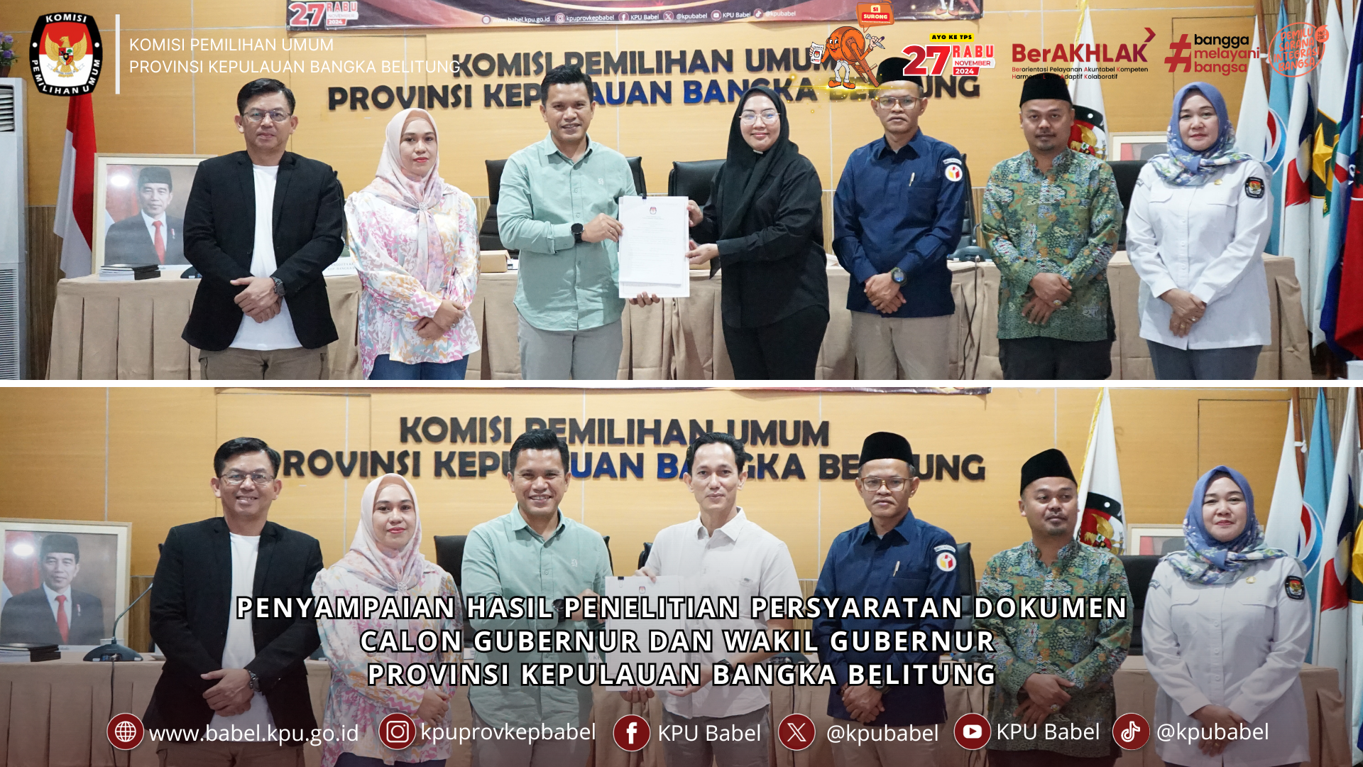 #SeperadikPemilih Komisi Pemilihan Umum Provinsi Kepulauan Bangka Belitung hari ini secara resmi menyerahkan hasil penelitian persyaratan dokumen bakal calon Gubernur dan Wakil Gubernur kepada para bakal calon dan Badan Pengawas Pemilu (Bawaslu). Acara yang berlangsung di kantor KPU Provinsi Kepulauan Bangka Belitung ini dihadiri oleh seluruh pihak terkait, termasuk perwakilan dari Bawaslu, serta LO bakal calon.