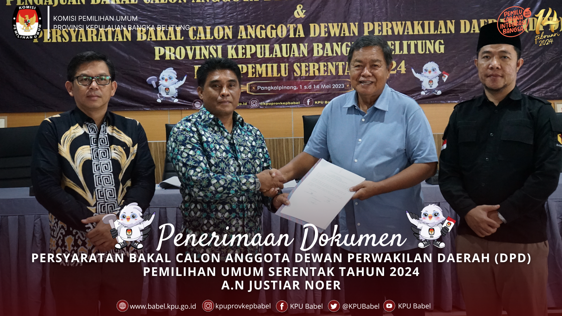 Pangkalpinang, babel.kpu.go.id - #SeperadikPemilih KPU Provinsi Kepulauan Bangka Belitung menerima Dokumen Pendaftaran Persyaratan Bakal Calon Anggota Dewan Perwakilan Daerah (DPD) Pemilu 2024 atas nama Justiar Noer bertempat di ruang rapat KPU Babel, Sabtu (6/5)