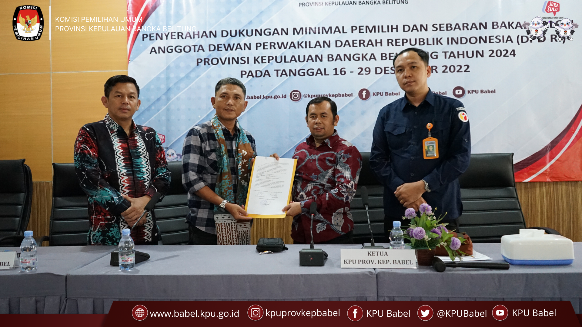 Pangkalpinang, babel.kpu.go.id - #SeperadikPemilih KPU Provinsi Kepulauan Bangka Belitung menerima persyaratan minimal dukungan dari bakal calon anggota DPD Pemilu 2024 bertempat di ruang rapat KPU Babel.