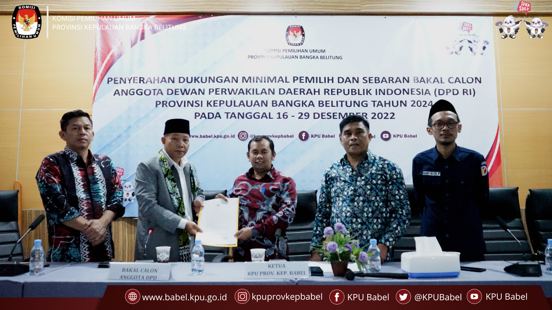 Kedatangan diterima oleh Ketua dan Anggota KPU Babel. Davitri mengatakan bahwa proses penyerahan dan verifikasi persyaratan minimal dukungan pemilih bakal calon anggota DPD Pemilu 2024 atas nama Junaidi Abdillah menjadi yang ke enam belas pada hari ini (29/12) sejak dibuka 16 Desember 2022 lalu, hingga ditutup 29 Desember nanti.