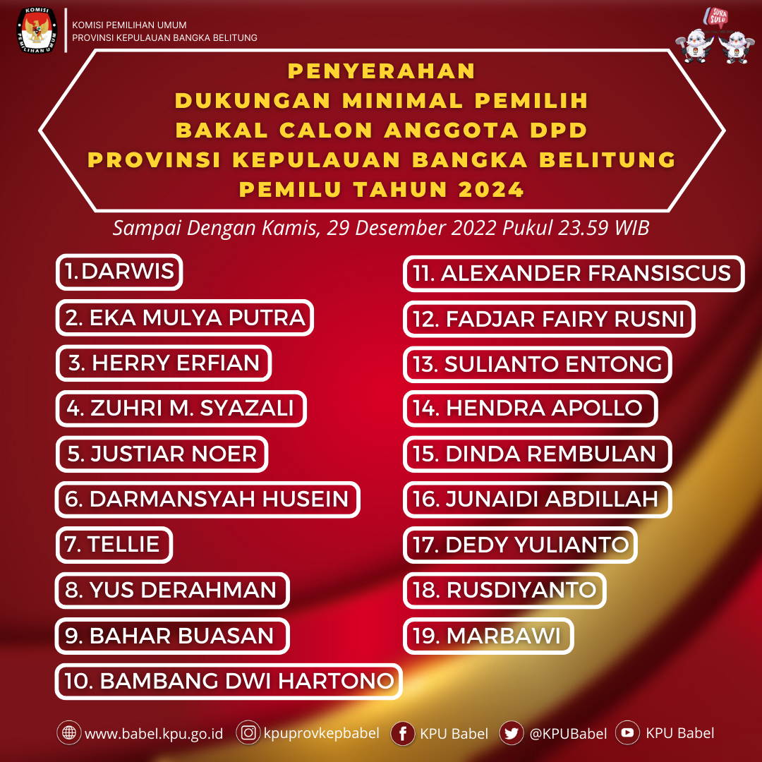 #SeperadikPemilih, inilah Bakal Calon Anggota DPD RI Provinsi Kepulauan Bangka Belitung yang melakukan penyerahan dukungan minimal pemilih ke KPU Provinsi Kepulauan Bangka Belitung sejak dibuka 16 Desember 2022 lalu, hingga ditutup 29 Desember 2022 ini.