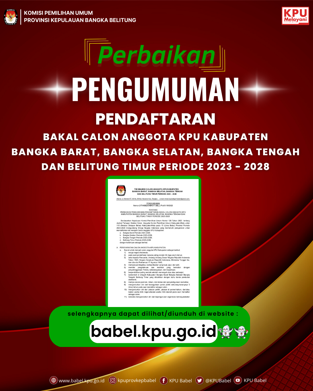 PERBAIKAN PENGUMUMAN PENDAFTARAN BAKAL CALON ANGGOTA KPU KABUPATEN BANGKA BARAT, BANGKA SELATAN, BANGKA TENGAH DAN BELITUNG TIMUR PERIODE 2023 - 2028