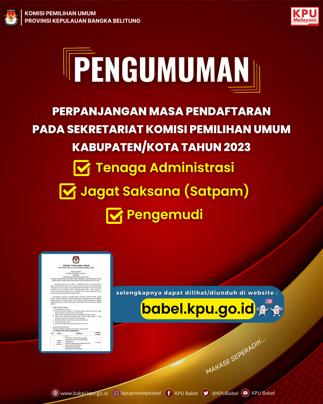 PERPANJANGAN MASA PENDAFTARAN TENAGAN ADMINISTRASI, SATPAM DAN PENGEMUDI SEKRETARIAT KPU KABUPATEN/KOTA TAHUN 2023