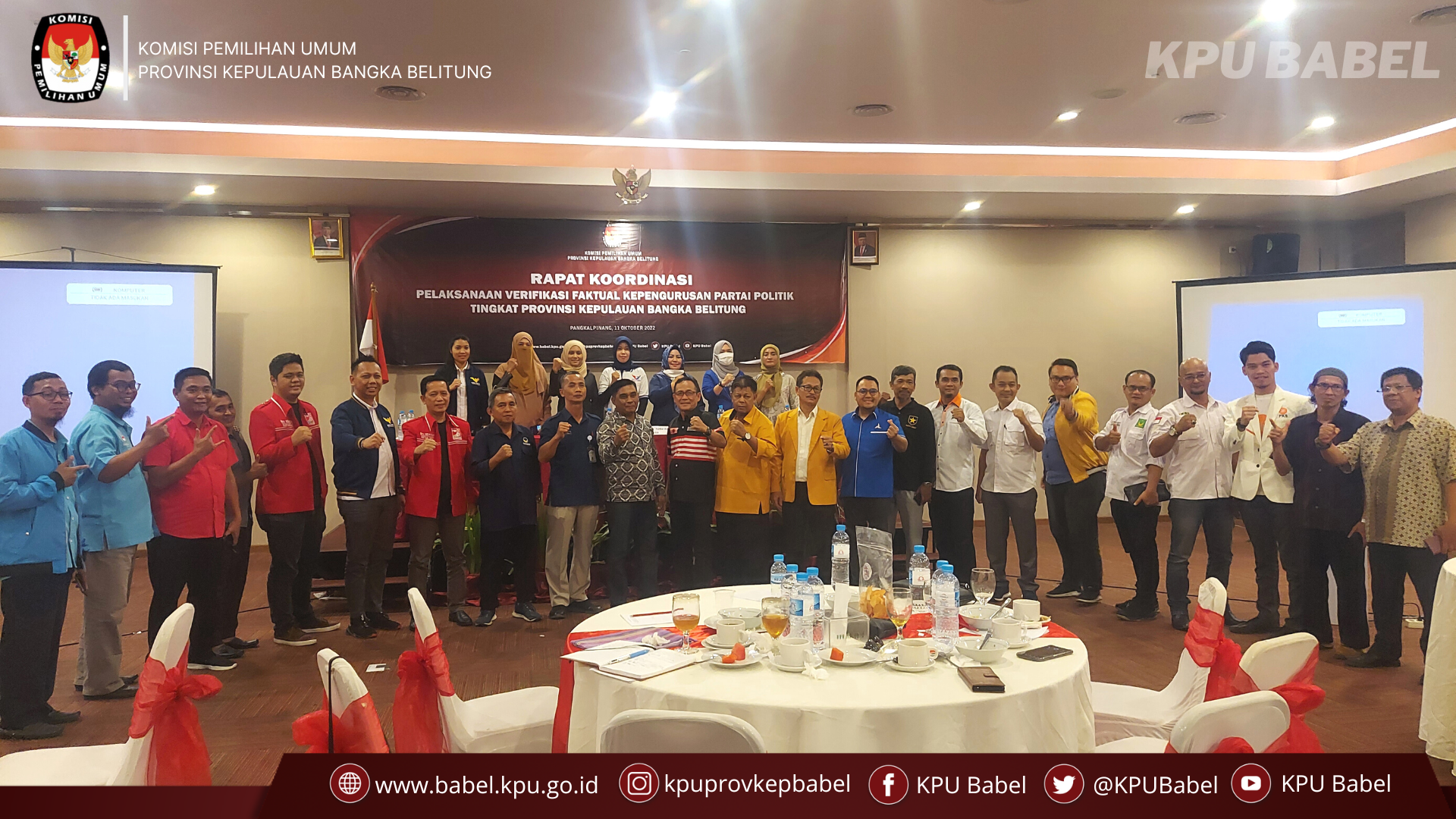 Pangkalpinang, babel.kpu.go.id - Komisi Pemilihan Umum (KPU) Provinsi Kepulauan Bangka Belitung menggelar Rapat Koordinasi Pelaksanaan Verifikasi Faktual Kepengurusan dan Keanggotaan Partai Politik Calon Peserta Pemilu Tahun 2024 Tingkat Provinsi, bertempat di Hotel Cordela, Pangkalpinang, Selasa (11/10/2022).