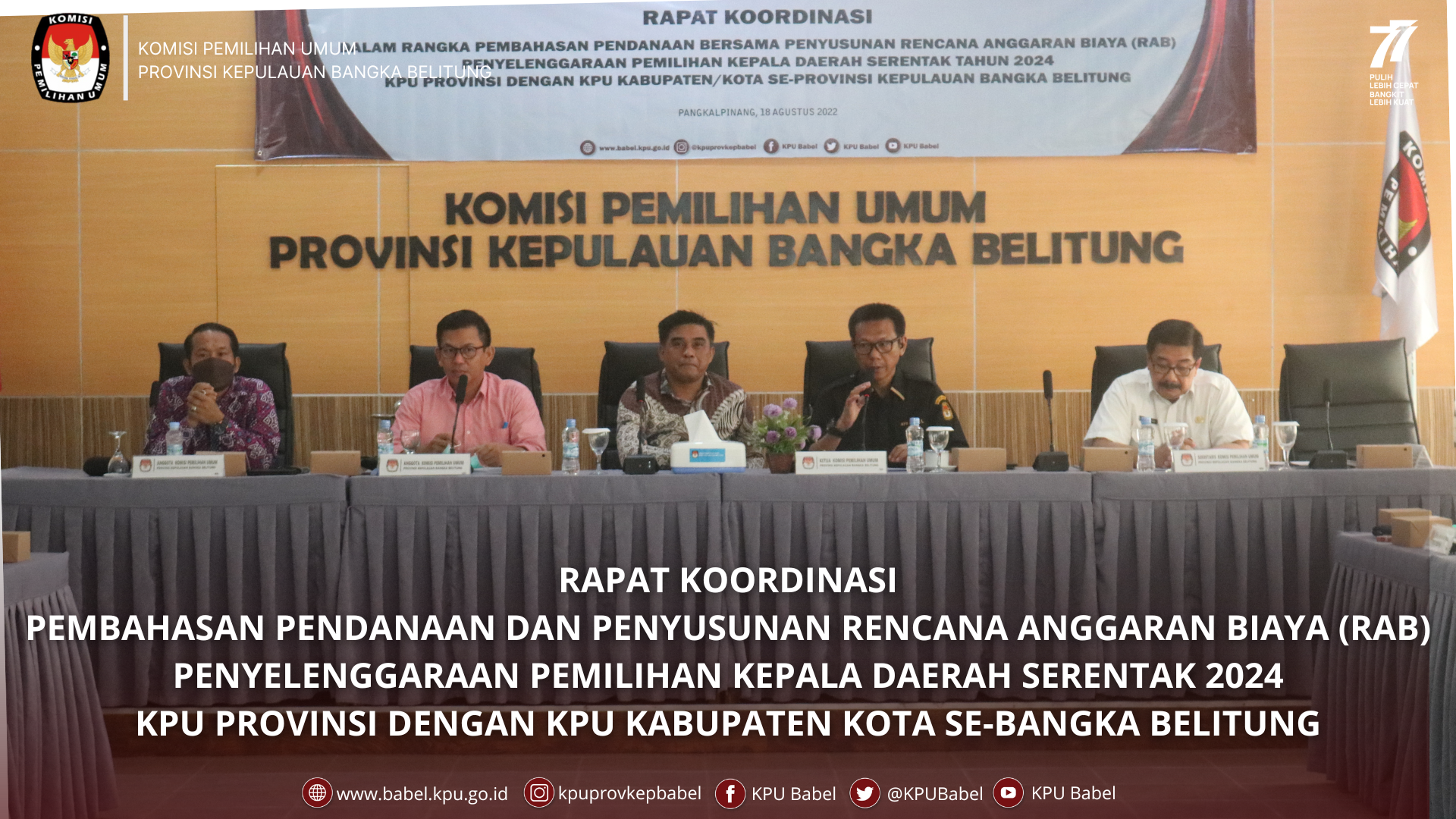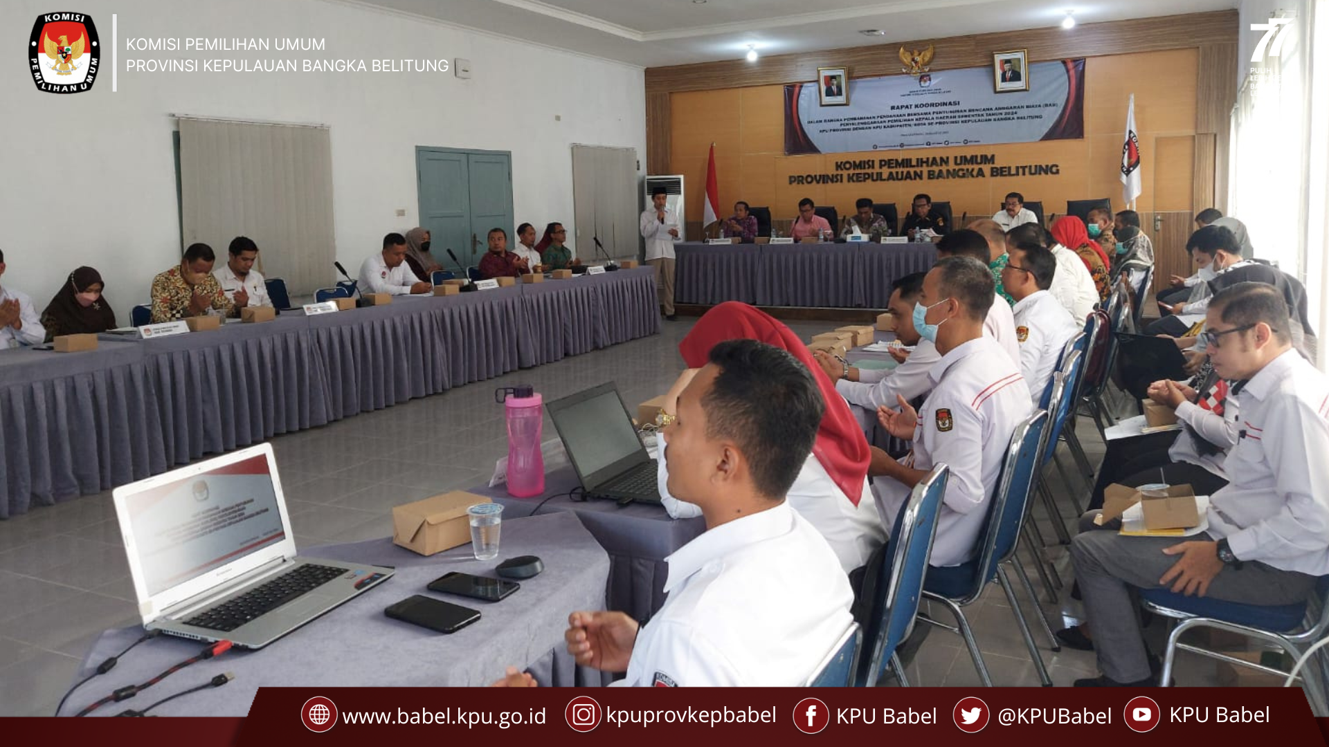 Pangkalpinang, babel.kpu.go.id - #SeperadikPemilih Jelang Pilkada 2024, Komisi Pemilihan Umum Provinsi Kepulauan Bangka Belitung menggelar Rapat Koordinasi Dalam Rangka Pembahasan Pendanaan Bersama Penyusunan Rencana Anggaran Biaya (RAB) Penyelenggaraan Pemilihan Kepala Daerah Serentak Tahun 2024, KPU Provinsi dengan KPU Kabupaten Kota Se-Provinsi Kepulauan Bangka Belitung. Rapat ini dilaksanakan di ruang rapat KPU Babel pada Kamis (18/8).
