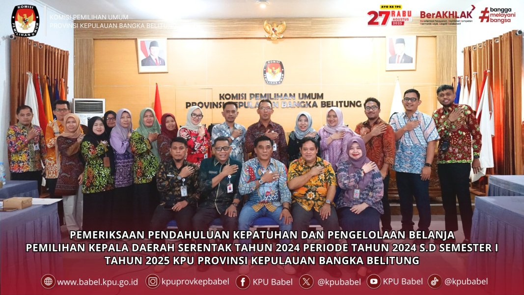 #SeperadikPemilih Komisi Pemilihan Umum (KPU) Provinsi Kepulauan Bangka Belitung menggelar rapat ekspos pemeriksaan pendahuluan kepatuhan atas pengelolaan belanja Pemilihan Kepala Daerah Serentak Tahun 2024, pada Jumat, 25 Juli 2025. Bertempat di Ruang Rapat KPU Provinsi, acara dimulai pukul 09.00 WIB hingga selesai.