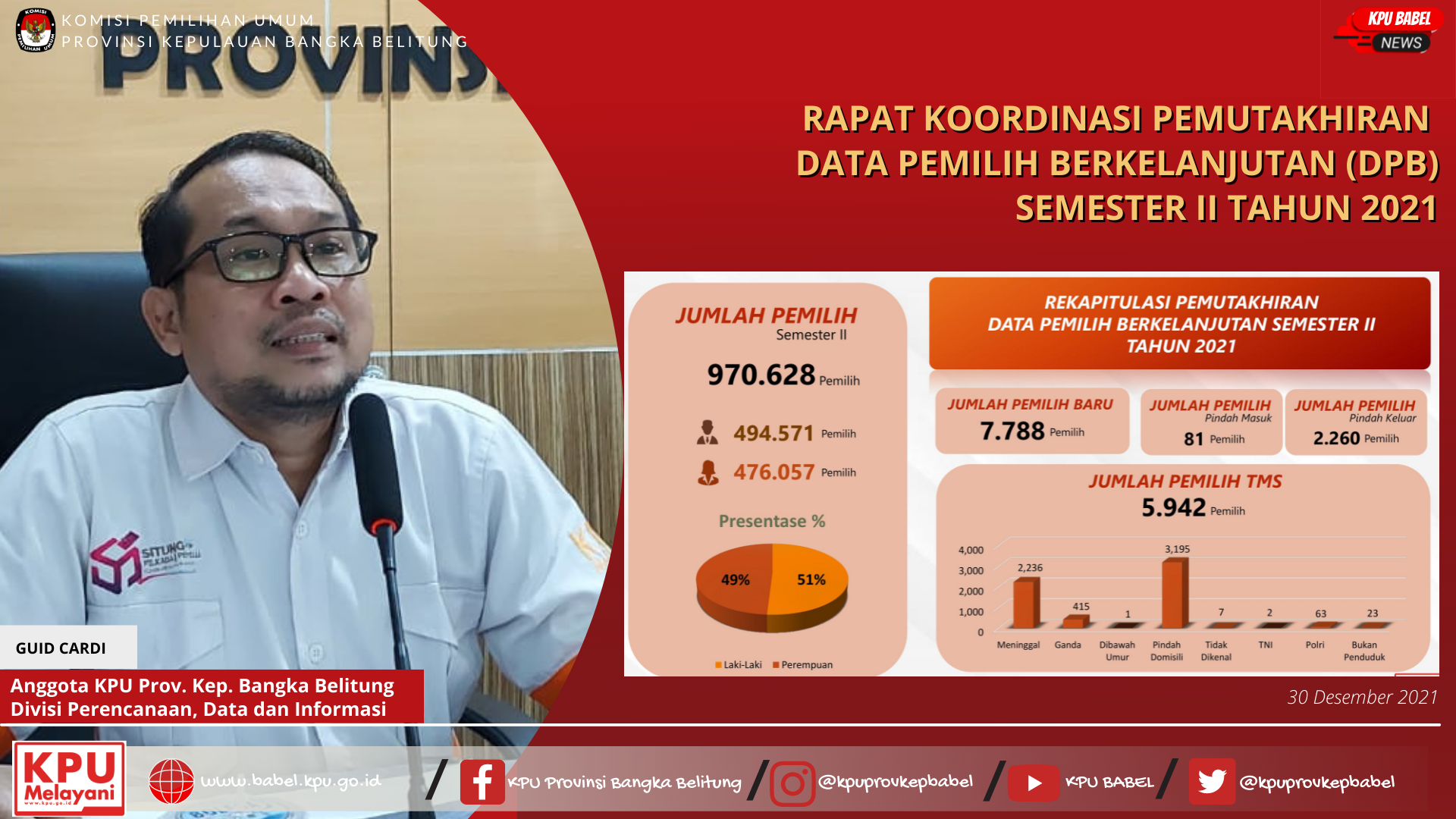 Pangkalpinang, Kamis (30/12/2021) - Komisi Pemilihan Umum Provinsi Kepulauan Bangka Belitung melaksanakan Rapat Koordinasi Data Pemilih Berkelanjutan Tahun 2021 Periode Juli s.d Desember di Tingkat Provinsi Kepulauan Bangka Belitung. Rapat koordinasi DPB ini diselenggarakan secara daring dan diikuti oleh para stakeholder terkait seperti Bawaslu Provinsi Babel, Polda Babel, Kodam 045 Garuda Jaya, Kanwil Kemenkumham Provinsi Babel, Dinas Pendidikan Provinsi Babel, Biro Pemerintahan Provinsi Babel, dan KPU Kabupaten/Kota se Provinsi Babel.