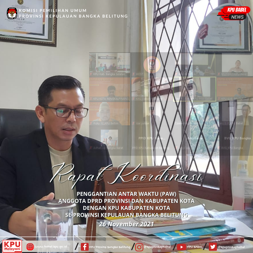 Pangkalpinang, Jum’at (26/11/2021) – Subbagian Teknis dan Hupmas Komisi Pemilihan Umum Provinsi Kepulauan Bangka Belitung melaksanakan kegiatan “Rapat Koordinasi Penggantian Antar Waktu (PAW) bagi Anggota DPRD Provinsi dan Anggota DPRD Kabupaten/Kota pada pukul 14.00 WIB – 17.00 WIB di Ruang Rapat Sekretariat KPU Provinsi Kepulauan Bangka Belitung dan diikuti secara daring melalui Zoom Meeting oleh KPU Kabupaten/Kota se-Kepulauan Bangka Belitung.