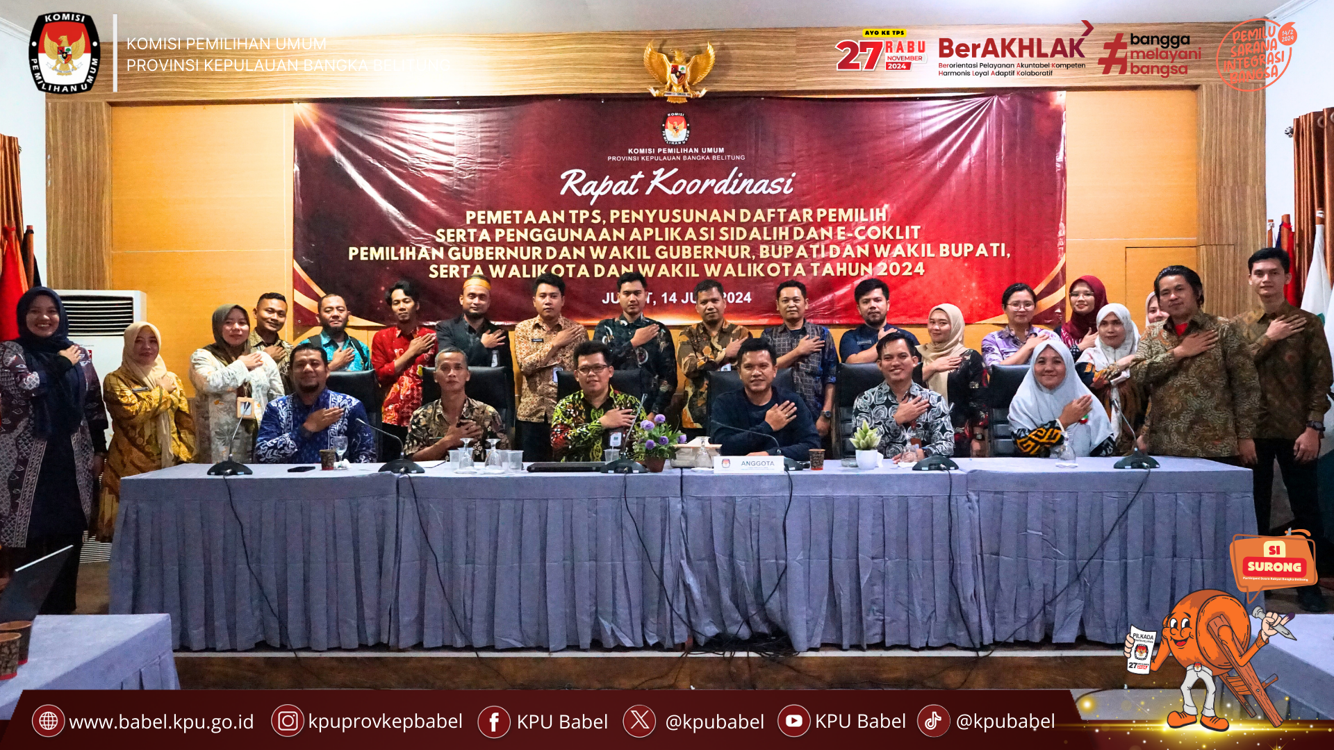 #SeperadikPemilih KPU Provinsi Kepulauan Bangka Belitung menggelar rapat koordinasi untuk memetakan Tempat Pemungutan Suara (TPS), menyusun daftar pemilih, serta penggunaan aplikasi Sistem Informasi Data Pemilih (SIDALIH) dan Elektronik Coklit (E-Coklit) dalam rangka persiapan Pemilihan Gubernur dan Wakil Gubernur, Bupati dan Wakil Bupati, serta Walikota dan Wakil Walikota se-Provinsi Kepulauan Bangka Belitung. (14/6)