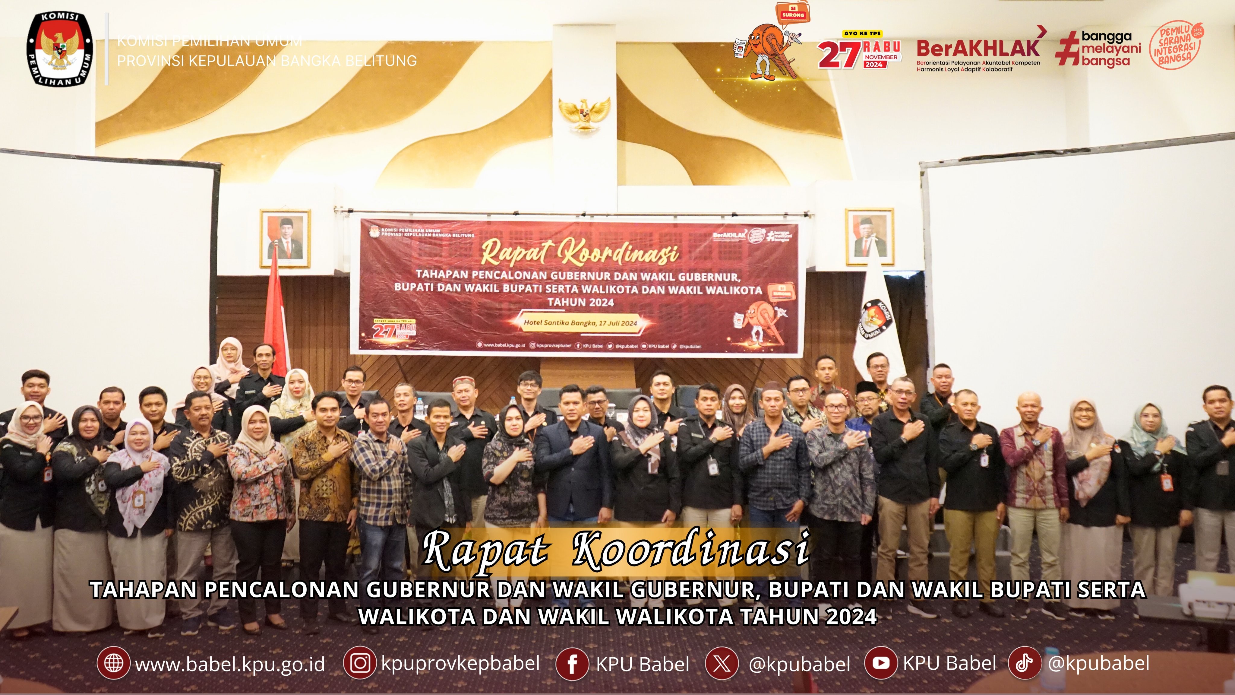 #SeperadikPemilih, Komisi Pemilihan Umum Provinsi Kepulauan Bangka Belitung mengadakan rapat koordinasi untuk membahas tahapan pencalonan Gubernur dan Wakil Gubernur, Bupati dan Wakil Bupati, serta Walikota dan Wakil Walikota Tahun 2024. Rapat ini diadakan di Hotel Santika Bangka Tengah. (17/7)