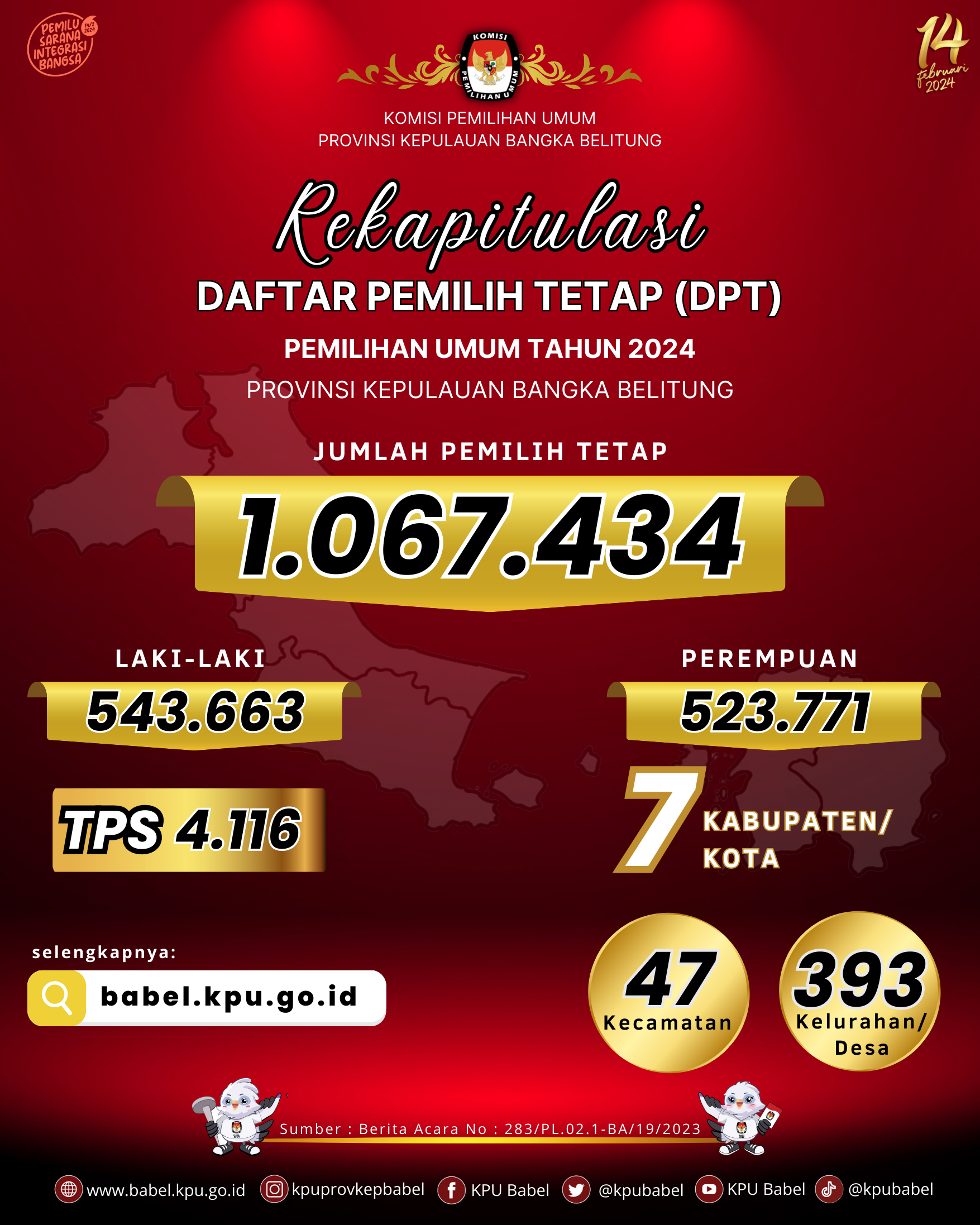 #SeperadikPemilih, Berikut Rekapitulasi Daftar Pemilih Tetap (DPT) Provinsi Kepulauan Bangka Belitung Pemilihan Umum Tahun 2024.