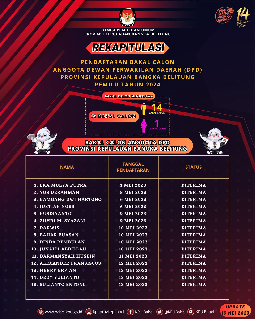 #SeperadikPemilih, berikut update informasi terkait Pendaftaran Bakal Calon Anggota DPD Provinsi Kepulauan Bangka Belitung pada Pemilu 2024 sampai dengan 13 Mei 2023..
