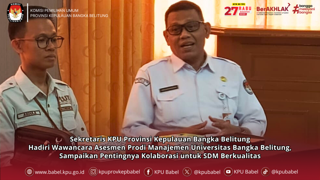 #SeperadikPemilih Bangka, 28 Juli 2025 – Sekretaris KPU Provinsi Kepulauan Bangka Belitung, Muchtaruddin, S.Sos., M.Si., menghadiri undangan wawancara asesmen lapangan Program Studi Manajemen Fakultas Ekonomi dan Bisnis Universitas Bangka Belitung (UBB) yang dilaksanakan pada Senin (28/7/2025) di Kampus Terpadu UBB, Kabupaten Bangka.