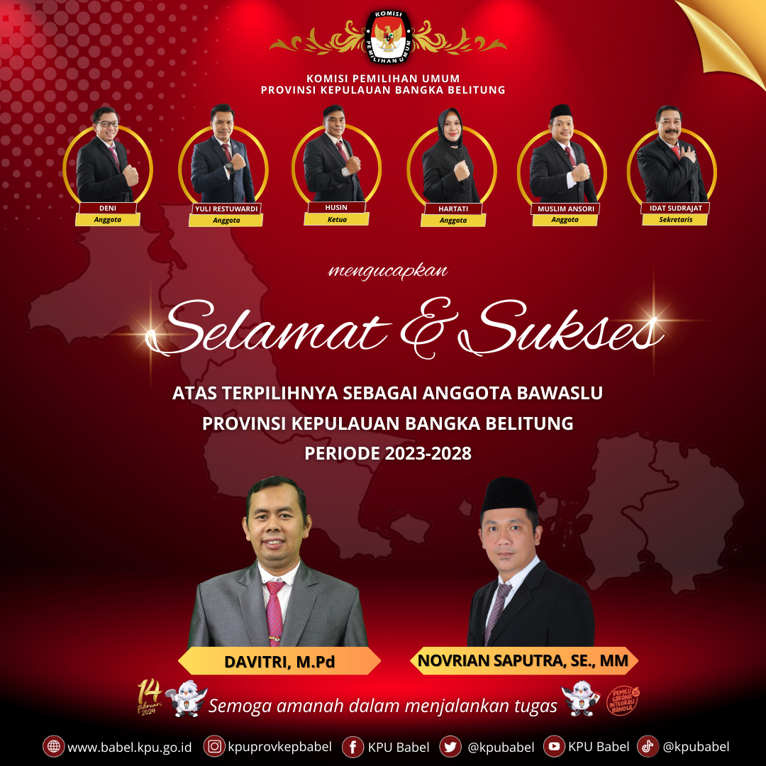 #SeperadikPemilih KPU Provinsi Kepulauan Bangka Belitung mengucapkan Selamat dan Sukses atas terpilihnya Davitri, M. Pd & Novrian Saputra, S. E., M. M sebagai Anggota Bawaslu Provinsi Kepulauan Bangka Belitung Masa Jabatan 2023 - 2028.