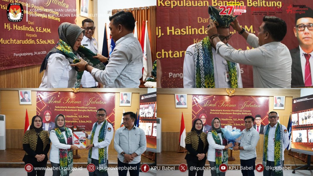 #SeperadikPemilih KPU Provinsi Kepulauan Bangka Belitung hari ini Kamis, 24 Juli 2025 menggelar acara serah terima jabatan Sekretaris KPU Provinsi Kepulauan Bangka Belitung dari Hj. Haslinda, S.E., M.M. kepada Muchtaruddin, S.Sos., M.Si. Acara berlangsung khidmat dan penuh kekeluargaan, dihadiri oleh Ketua dan Anggota Provinsi Kepulauan Bangka Belitung beserta jajaran, Ketua dan Sekretaris KPU Kabupaten/Kota se-Babel, serta diikuti secara daring oleh Ketua dan Sekretaris KPU Kabupaten Belitung dan Belitung Timur.