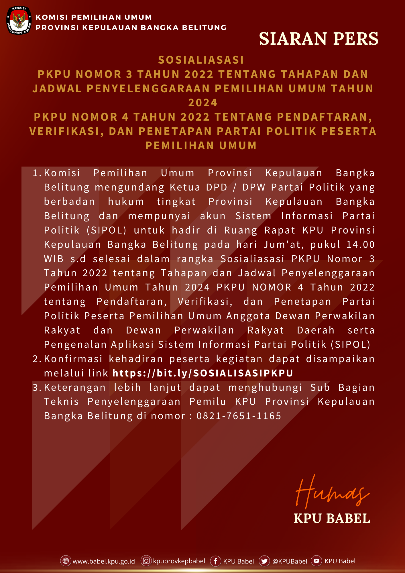 Hari Jum'at, 29 Juli 2022 pukul 14.00 WIB, KPU Provinsi Kepulauan Bangka Belitung akan menyelenggarakan Sosialisasi Peraturan KPU Nomor 3 Tahun 2022 dan Peraturan KPU Nomor 4 Tahun 2022 serta Pengenalan Aplikasi Sistem Informasi Partai Politik (SIPOL).