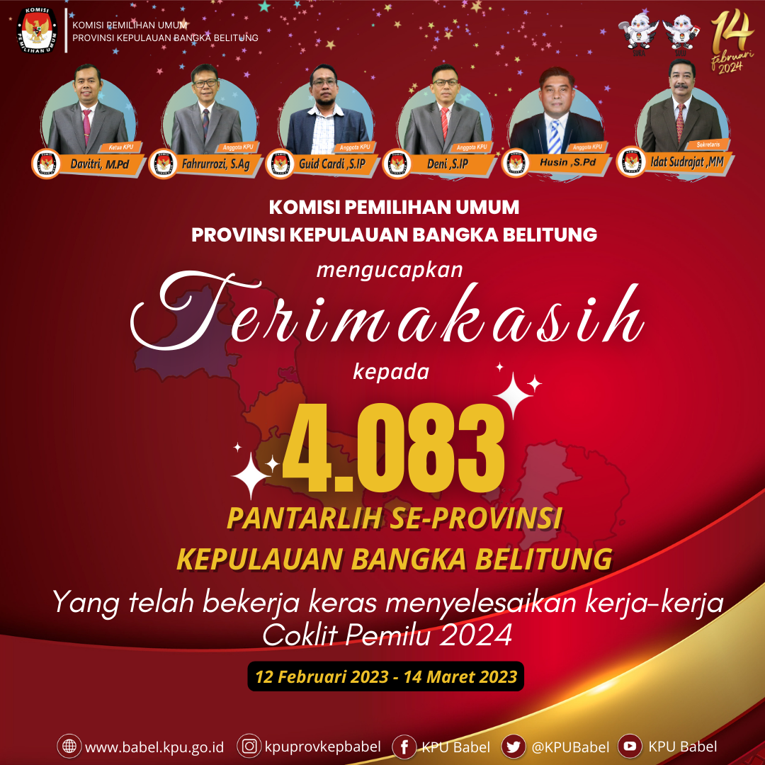 #SeperadikPemilih, KPU Provinsi Kepulauan Bangka Belitung mengucapkan Terima Kasih Kepada 4.083 Petugas Pemutakhiran Data Pemilih (Pantarlih), Stakeholder dan Seluruh Masyarakat Bangka Belitung yang telah menyukseskan tahapan Pemutakhiran Data Pemilih Pemilu Serentak Tahun 2024 pada tanggal 12 Februari s.d 14 Maret 2023.