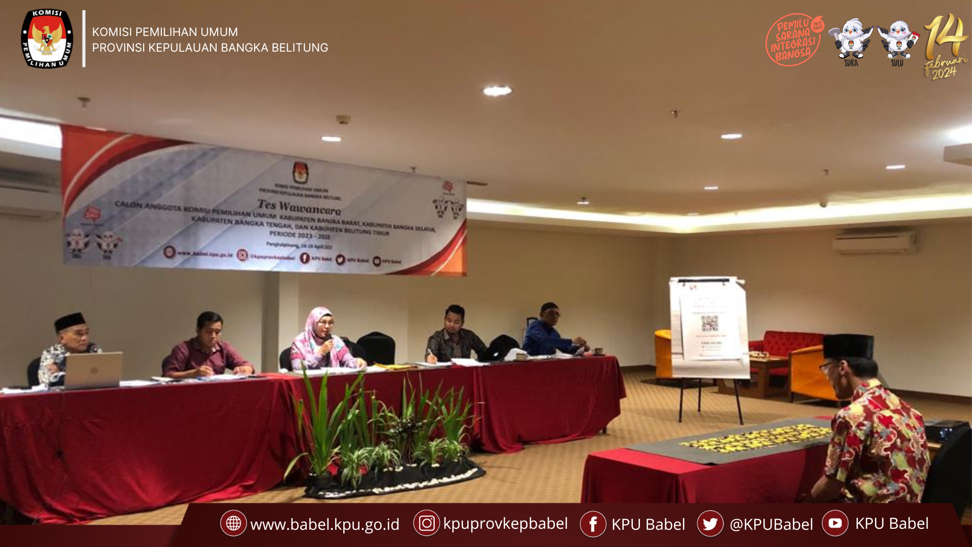 Pangkalpinang, babel.kpu.go.id - Peserta seleksi calon Anggota KPU Kabupaten Bangka Barat, Kabupaten Bangka Selatan, Kabupaten Bangka Tengah dan Kabupaten Belitung Timur periode 2023-2028 mengikuti tes wawancara bertempat di Swiss-Belhotel Pangkalpinang.