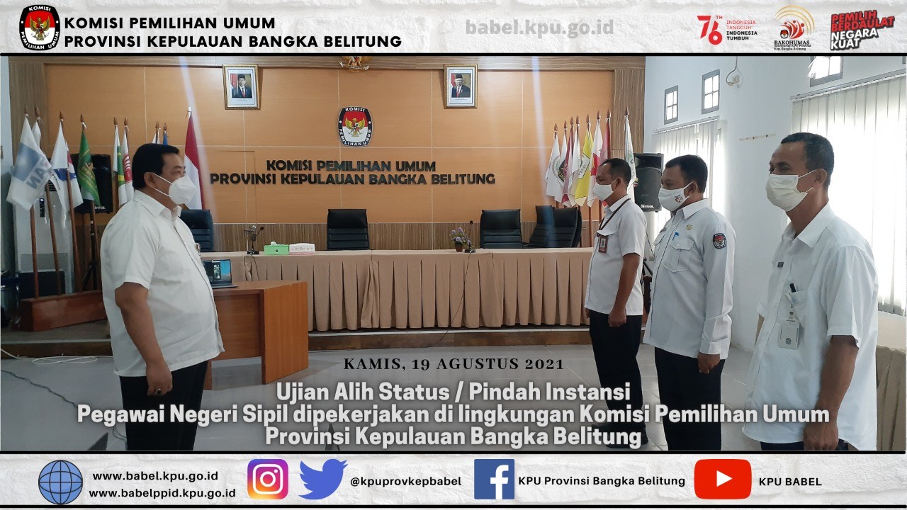 Komisi Pemilihan Umum Provinsi Kepulauan Bangka Belitung (KPU BABEL) melaksanakan ujian wawancara Alih Status Pegawai Negeri Sipil dipekerjakan di Lingkungan KPU Provinsi Kepulauan Bangka Belitung pada hari Kamis, 19 Agustus 2021 dengan diikuti oleh 5 orang peserta. Ujian dimulai pukul 09.30 WIB s.d pukul 13.00 WIB bertempat di Ruang Rapat KPU Provinsi Kepulauan Bangka Belitung.