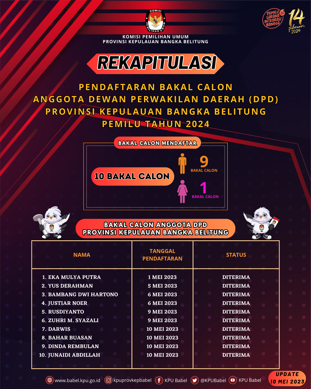 #SeperadikPemilih, berikut update informasi terkait Pendaftaran Bakal Calon Anggota DPD Provinsi Kepulauan Bangka Belitung pada Pemilu 2024 sampai dengan 10 Mei 2023..